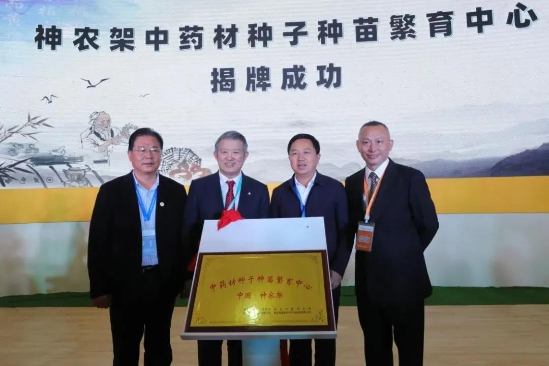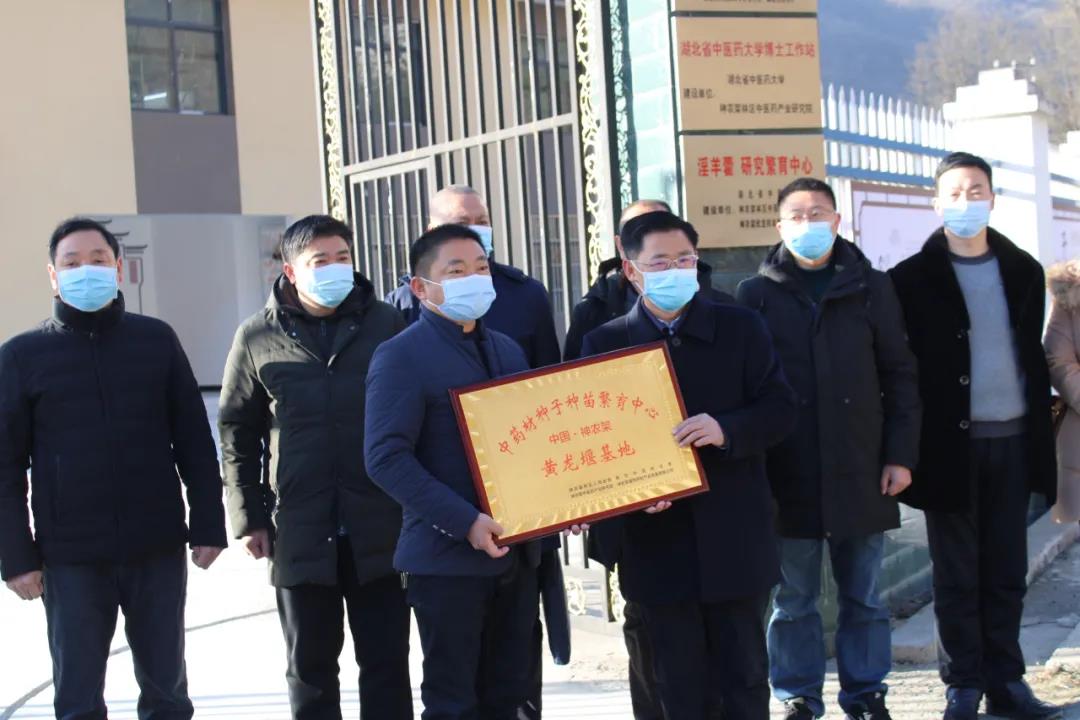 丨神農(nóng)架林區(qū)黨委副書(shū)記、政法委書(shū)記羅棟梁(右)代表神農(nóng)架林區(qū)政府為神農(nóng)架道地藥材公司黃龍堰基地授牌。