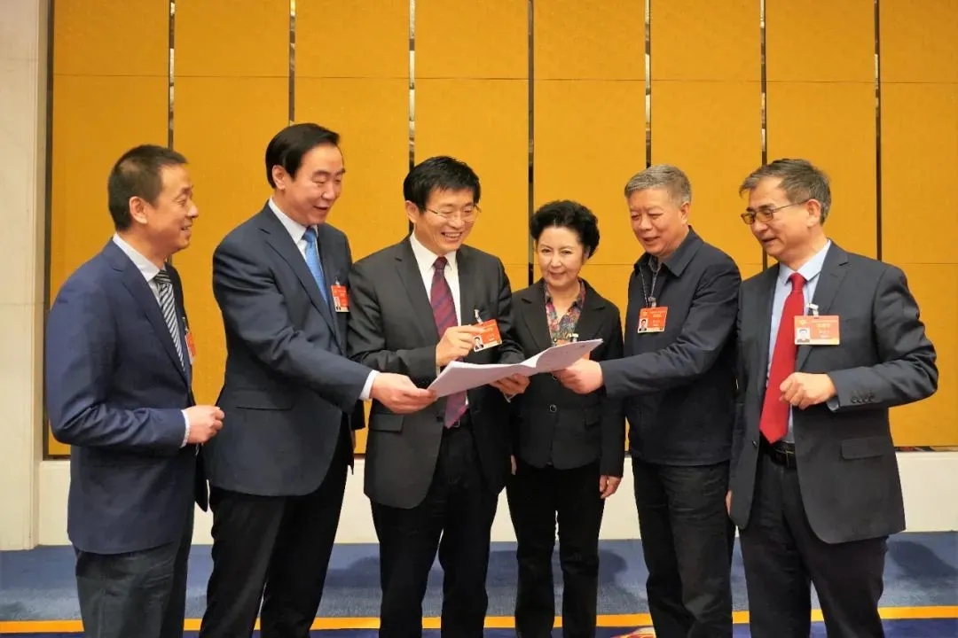 于文明(左三)等部分中醫(yī)藥界委員熱議政府工作報(bào)告。朱夜明 攝