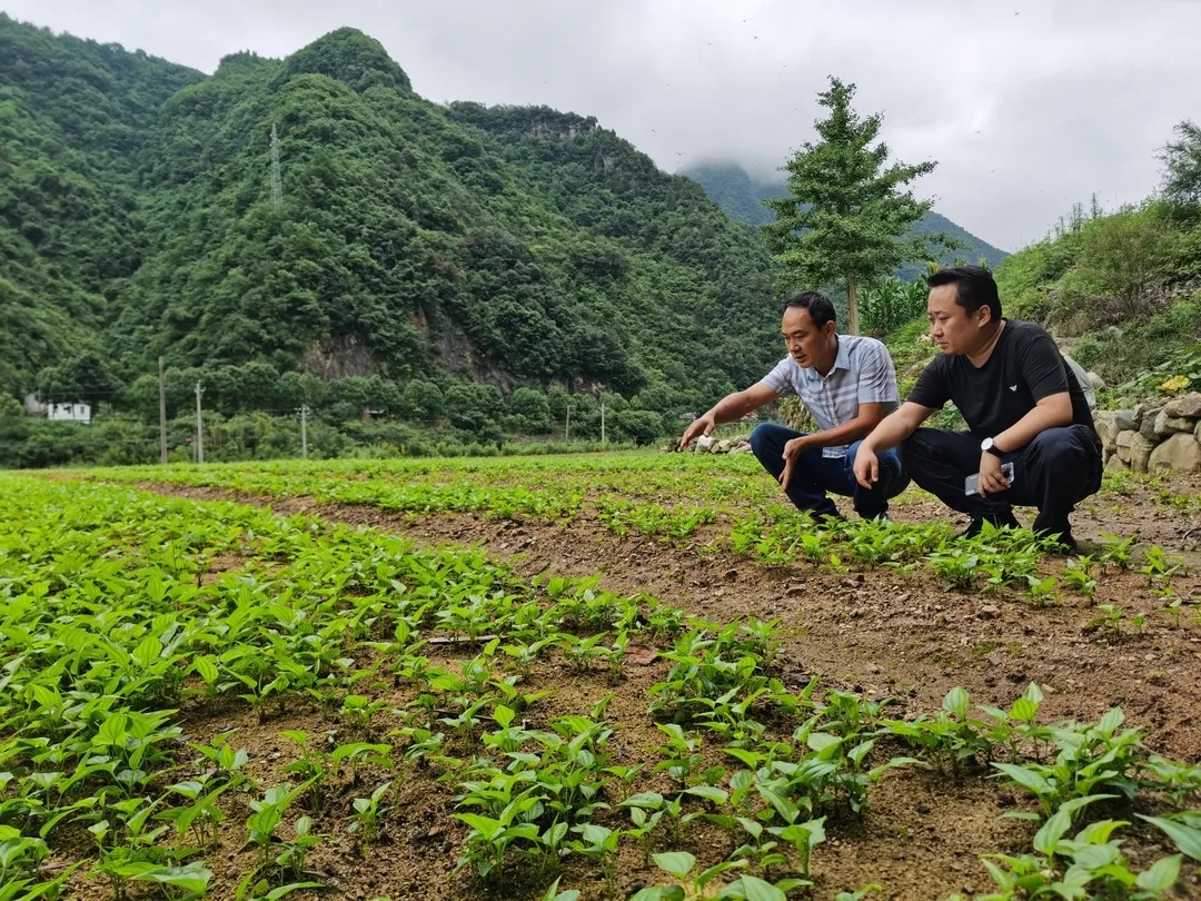 ▲神藥公司董事、總經(jīng)理薛超(右)、宜昌市霧渡河鎮(zhèn)百部基地總經(jīng)理秦發(fā)忠(左)實(shí)地考察田間管理