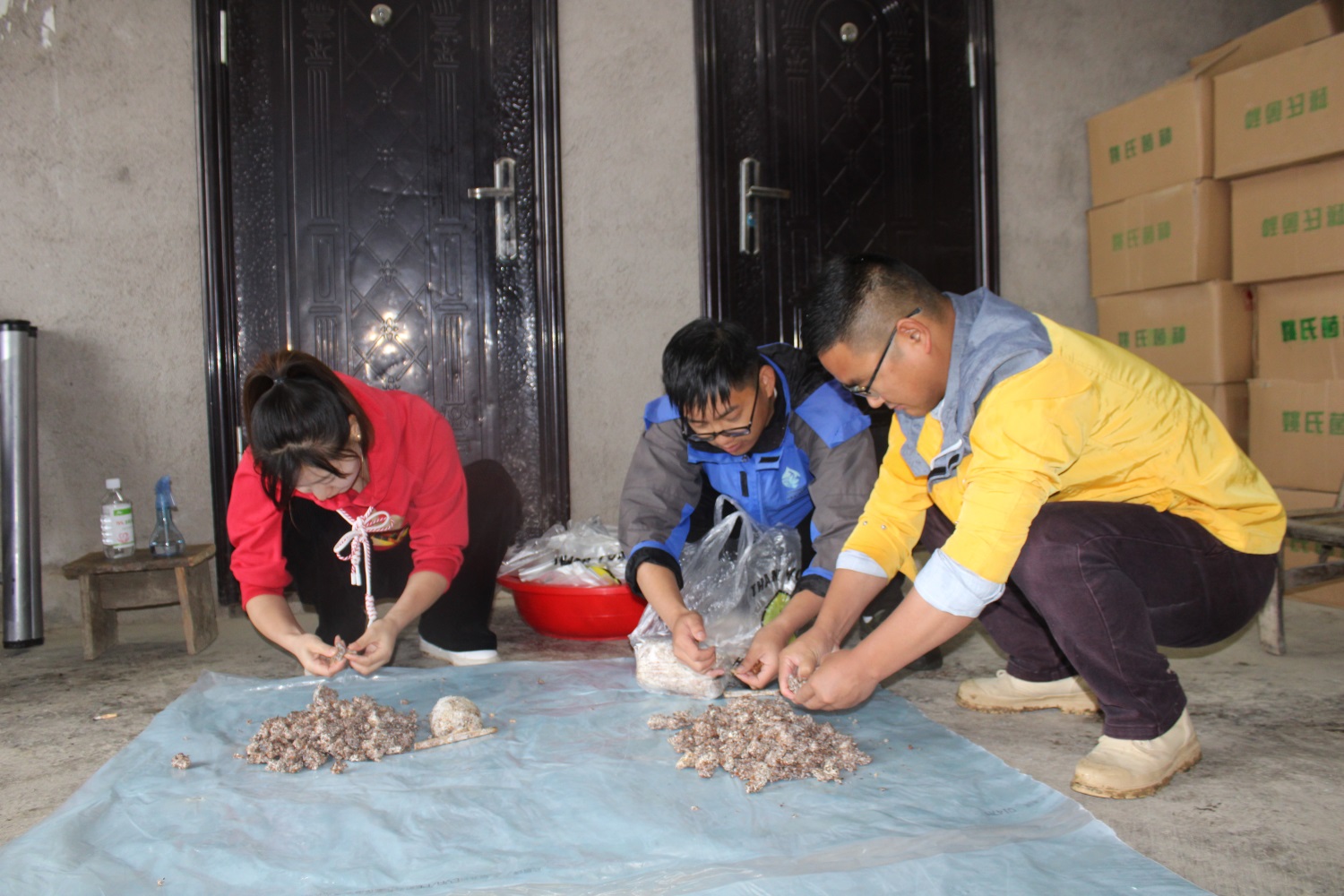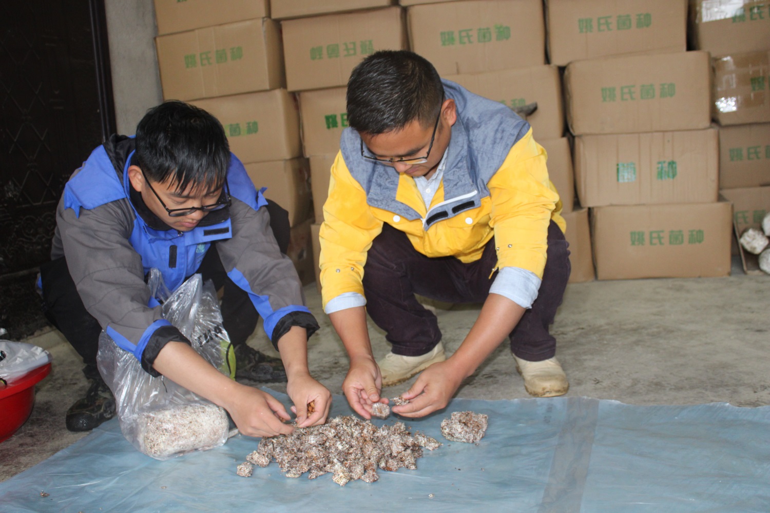 神藥公司建立天麻育種大棚,不僅種植天麻,同時也進行自主育種,圖為神藥公司科研工作人員進行粉麻拌種。